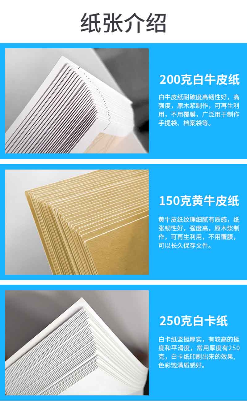印刷紙張:銅版紙、雙膠紙、啞粉紙、珠光紙、其他藝術(shù)紙(藝術(shù)紙種類(lèi)較多我們可以免費(fèi)提供紙樣供您選擇)
