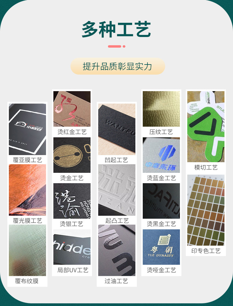 常用工藝:覆膜(啞膜、光膜)、壓紋、凹凸印、局部uv、燙銀、燙金、印專色(PANTONE色)、鏤空、鐳射、打孔、疊印、絲網印、透印、過光油、啞油等